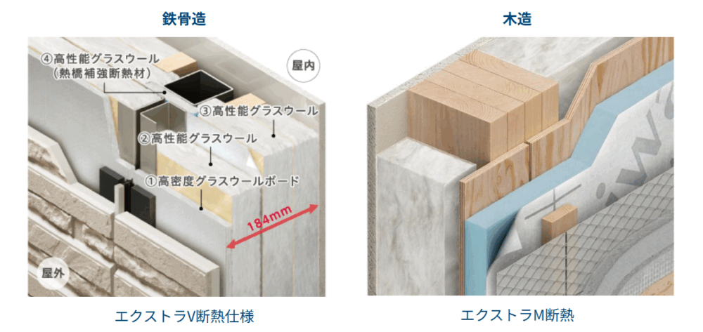 • 断熱対策:「充填断熱」と「外張り断熱」を組み合わせた付加断熱(内外ダブル断熱)を採用